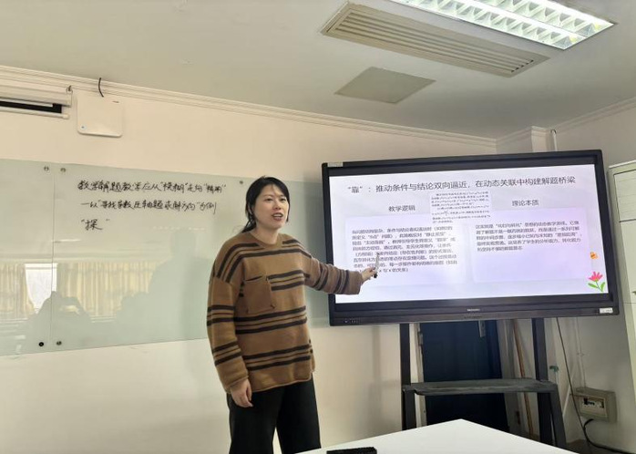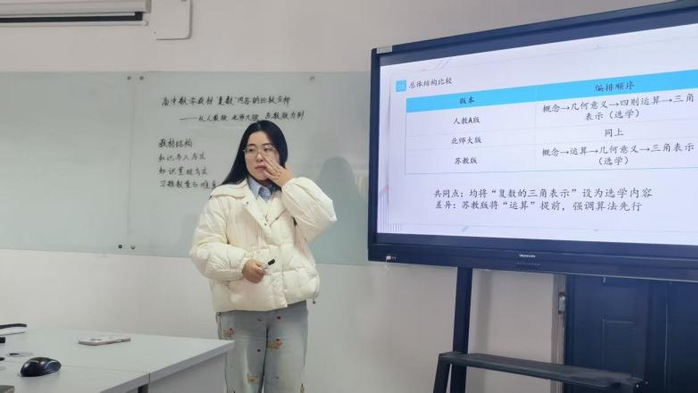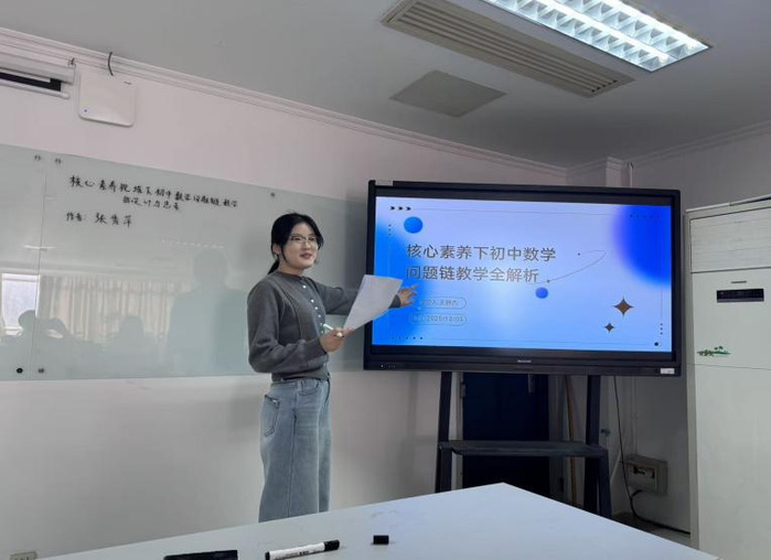 在汇报环节中,王静杰从核心素养角度探讨了初中数学问题链教学,认为通过逻辑清晰的问题序列能够引导学生主动探究知识、促进思维发展,有效落实核心素养。吴佳佳对人教A版、北师大版及苏教版教材中“复数”内容进行了比较分析,注意到各版本均缺少真实情境题目,并建议教师可整合教学资源,融入跨学科应用习题,从而加强学生的数学建模与实际问题解决能力。仲瑶瑶围绕导数解题教学,探讨了当前教学中存在的“模糊化”现象,并介绍了“探、靠、换”三种精确化指导策略,强调应帮助学生建立可操作的思维路径。周嘉怡结合国家推动教育智能化的政策背景,提出新一代人工智能技术有望成为突破传统教学瓶颈的重要助力。