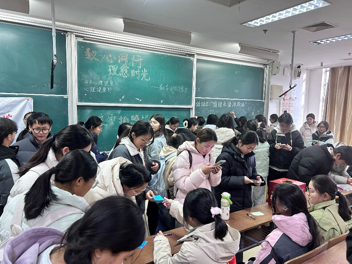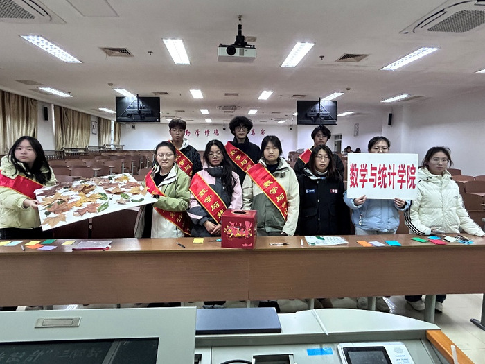 为给迎接期末复习的同学递上一张“减压通行证”,释放学习工作压力。数学与统计学院心理健康部主办的“12·5心理健康日”系列活动在主楼B103教室温暖启幕。活动以“数心同行·理愈时光”为主题,通过“盲盒解忧”“叶笺心声”“定格青春”三大创意板块,为百余名同学送上冬日专属“心动补给”。
