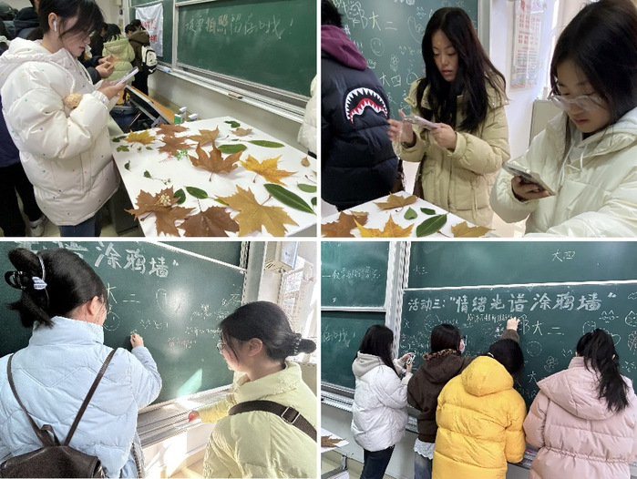 三项创意互动环节为参与活动的同学搭建情绪出口与情感桥梁。“盲盒解忧”环节中,参与者在“情绪书写”区写下烦恼并拍照留存,随即抽取他人手写的祝福或简笔画盲盒回信,感受来自他人的善意;“叶笺心声”以自然为媒,同学们将心底感言写于银杏、香樟等落叶背面,搭配枯枝、彩纸拼贴创作,阳光穿透时叶脉文字若隐若现,勾勒独特心灵图景;“定格青春”环节里,用浅蓝、明黄、浅紫、暖橙四色形成涂鸦墙,同学们用粉笔在涂鸦墙上留下“心情印记”,定格青春群像。活动贴近学生群体,富有创意,鼓励同学放下负担和烦恼,收获共鸣和温暖。