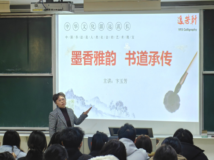 讲座紧扣“墨香雅韵 书道承传”主题,卞玉芳老师从“书法是什么”切入,系统阐释书法的起源与发展脉络,指出书法是以汉字为载体的独特传统艺术,其源头可追溯至殷商甲骨文。她结合经典碑帖实例,生动解析篆、隶、楷、行、草五种核心字体的风格特质,并分享王羲之“入木三分”、怀素以蕉叶为纸刻苦练字等名家轶事,以先贤事迹激励师生秉持钻研精神,深耕书法学习。