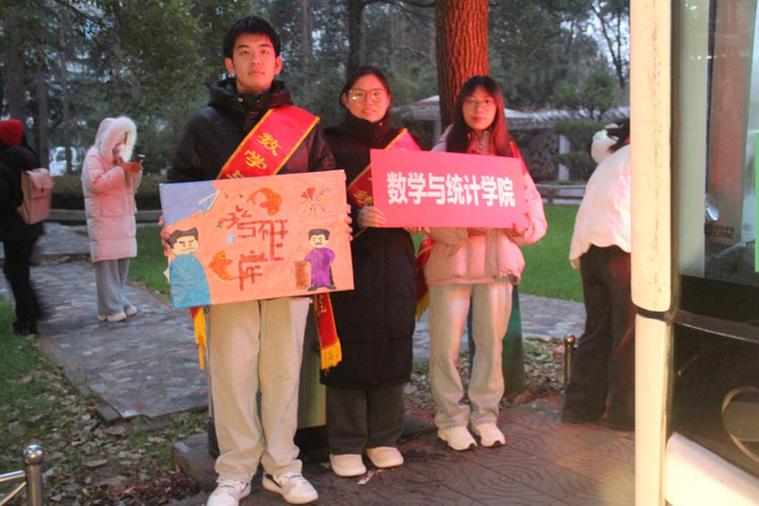 12月20日清晨,通榆校区陈毅像前暖意融融。学院党政领导、辅导员、班主任及志愿者早早集结,用饱满热情为考生加油鼓劲。6点40分,送考专车整装待发,老师们逐一核对信息,轻声叮嘱“沉着审题、相信积累”“笔锋所至皆坦途”。志愿者引导考生有序上车,一句句“一战成硕”的祝福驱散寒意。7点15分,送考车队准时启程,平稳驶向各考点。