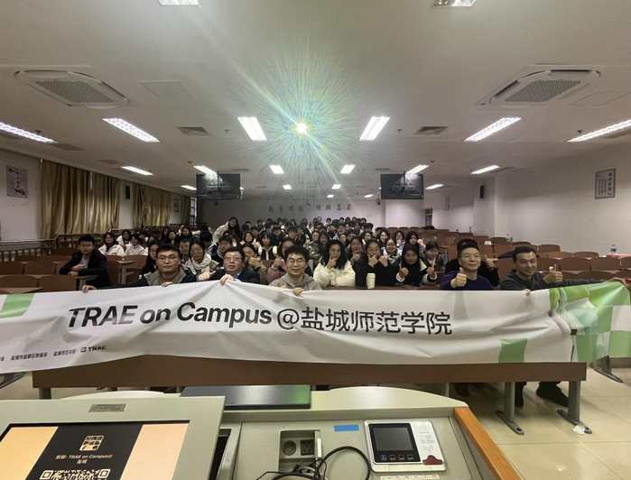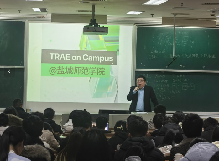 1月7日下午,“TRAE校园行,智创未来”主题活动在通榆校区主楼B103教室成功举办。本次活动由盐城高新区管委会、盐城市盐都区数据局、盐城师范学院数学与统计学院联合主办,TRAE(字节跳动旗下AI编程产品)提供技术支撑。来自学校各专业近百名师生参加了活动。