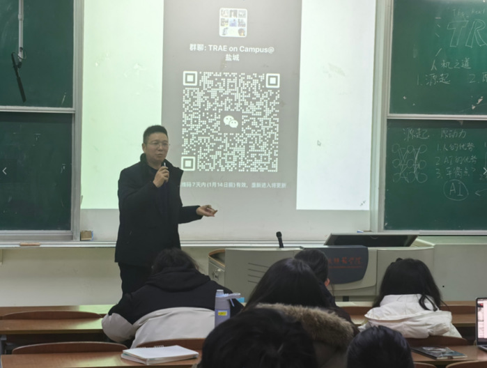 活动特别邀请了One One Talk CTO兼联合创始人彭超,以及典枢科技(盐城)有限公司总经理张金波两位专家,分别围绕AI编程工具TRAE平台在智能编程、多模态生成等方面的核心功能,以及大模型时代的新兴技术进行了专题报告。活动现场气氛热烈,同学们积极聆听并踊跃互动。