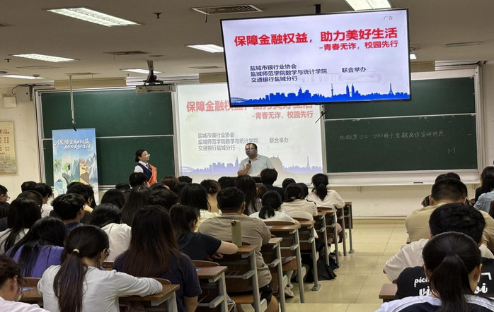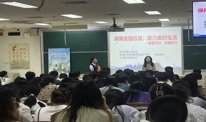 为切实筑牢校园反诈安全防线,提升学生风险防范意识与识骗防骗能力,近日,数学与统计学院联合盐城市银行业协会、交通银行盐城分行,成功举办“反诈宣传进校园”主题教育活动。学院党委副书记左飞主持活动,盐城市银行业协会消保部主任洪震、交通银行盐城分行副行长王欣齐出席活动,学院两百余名学生参加讲座。
